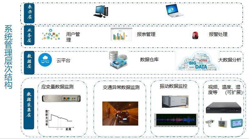 迪博科技針對運輸行業日益迫切對隧道健康安全監測的需求,開發出了一種基于光纖傳感技術的隧道健康監測預警系統。隧道監測系統,采用光纖感測、物聯網、大數據、模式識別、云計算、BIM 等技術,自動進行“數據采集、數據存儲、數據分析”,智能分析隧道運行安全大數據,精準監測預警隧道運營期間的襯徹掉塊、泥石流和危巖落石、頂部非法挖掘鉆孔侵害、拱頂滲漏水、內部火災、分層和縱向不均勻沉降、環向應變、變形縫位移、異物入侵、爆破和微振動、圍巖水(土)壓力、有害氣體、鋼筋銹蝕、內村(管片) 結 構受力等數據和事件,進行精準監測和異常事件定位,能聯控攝像機、無人機、消防等相關設備。系統實現了“研發、生產、實施“為一體的交鑰匙項目,能可靠實現隧道運營安全管理工作的“數據化、可視化、信息化、精準化”。系統的科技創新和技術水平位于行業前列。